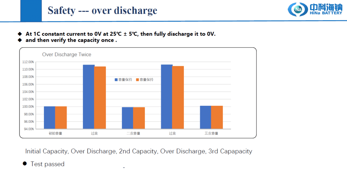 Sécurité : Les batteries sodium-ion sont souvent considérées comme bien plus sécuritaires que les batteries lithium-ion. Elles ont un risque nul de surchauffe et d’incendie, un avantage important pour les utilisations en résidentiel ou en bâtiments publics notamment. Le graphique ci-dessous tiré du constructeur HINA démontre une absence de surchauffe et d’explosion, même avec une surcharge jusqu’à 6V de la cellule !
