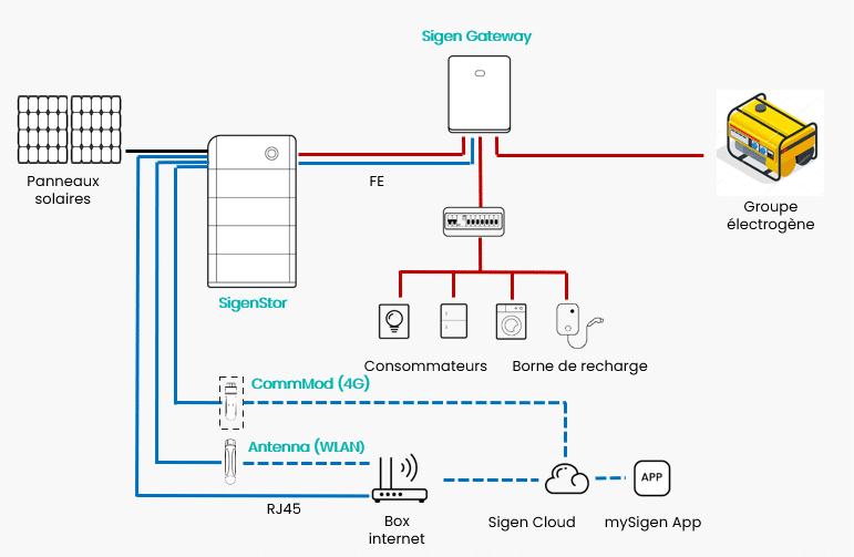 Si vous êtes en site isolé, le GATEWAY sera obligatoire, et fera l’interface entre votre groupe électrogène et votre système SIGENERGY, permettant à ce dernier d’utiliser le groupe en cas de recharge des batteries si nécessaire.